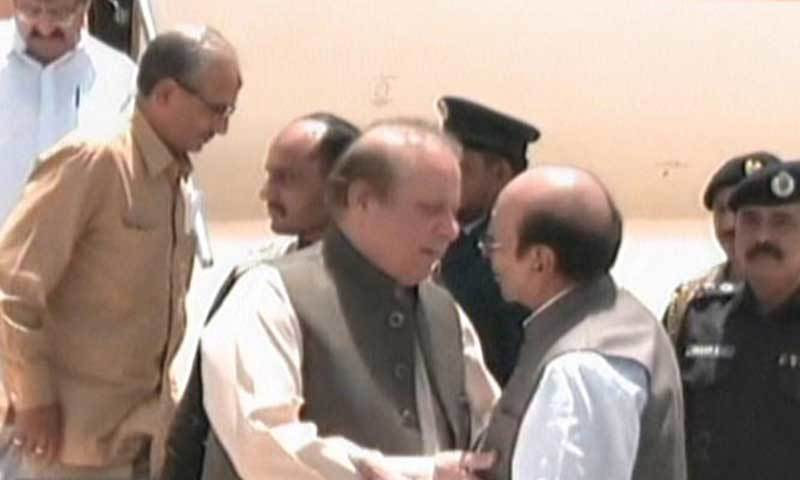 وزیر اعظم نواز شریف سکھر تا ملتان موٹروے کا سنگ بنیاد رکھنے کے لیے سکھر ایئر پورٹ پہنچے تو سندھ کے وزیراعلی سید قائم علی شاہ نے دیگر حکام کے ہمراہ ان کا استقبال کیا۔